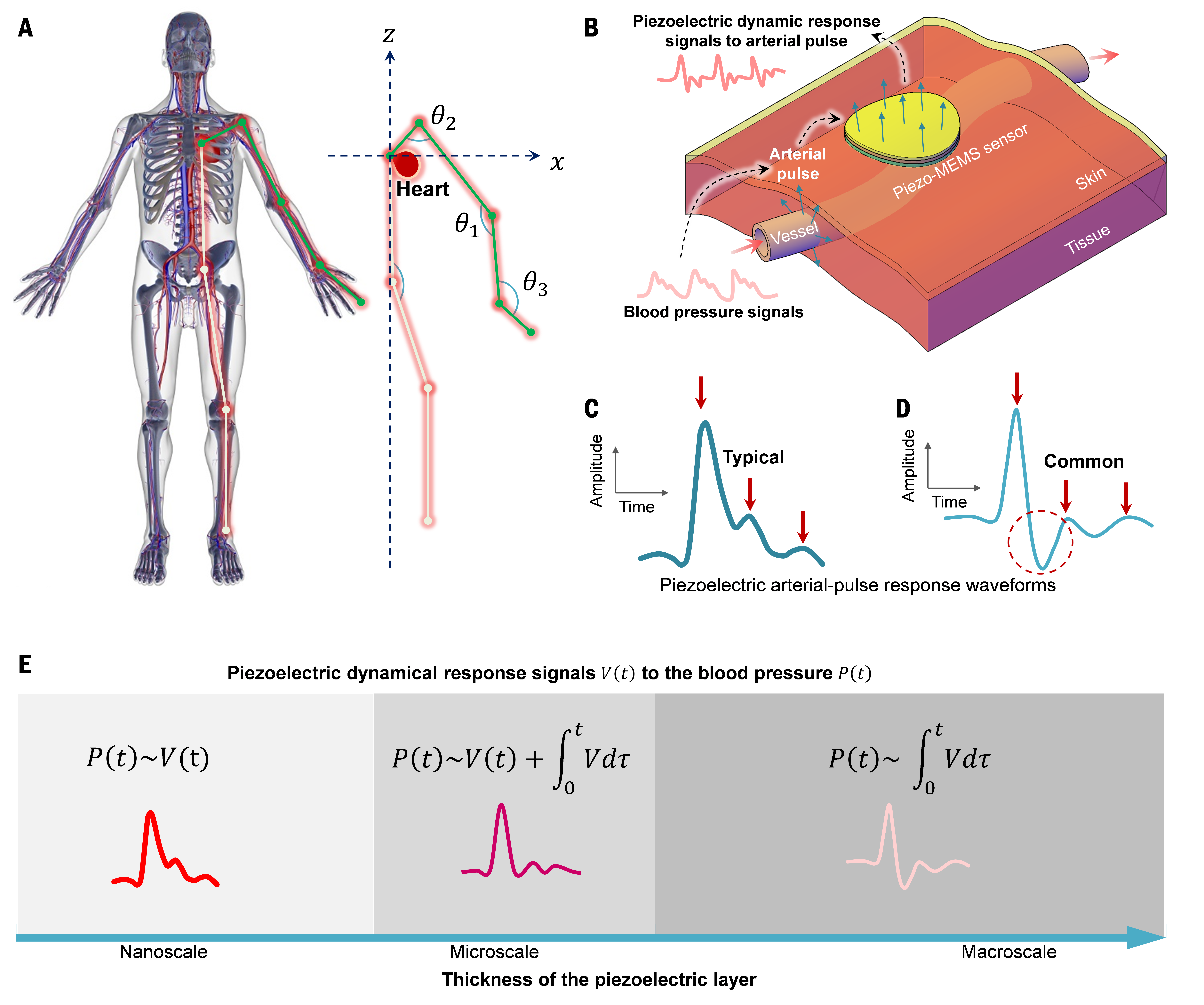 In this work, the researchers first elucidate the correlation between piezoelectric pulse waves and blood pressure waves via theoretical, simulation, and experimental analysis of these dynamics. Based on this correlation, they investigated the feasibility of achieving wearable continuous blood pressure monitoring without motion artifacts, using a single piezoelectric sensor. These findings eliminate the controversy over the arterial pulse wave piezoelectric response, and could potentially be used to develop a portable wearable continuous blood pressure monitoring device for the early prevention and daily control of hypertension.