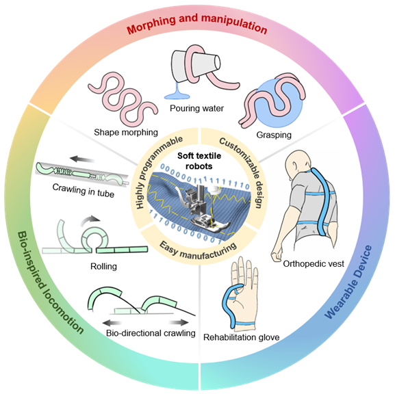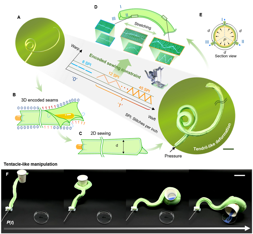 近日,350vip8888新葡的京集团张文明教授团队与同济大学航空航天与力学学院李汶柏研究员合作研究,在Science Advances上发表文章“Encoded sewing soft textile robots”,首次提出了一种基于“编码缝制约束力学”的气动织物软机器设计和制造的新方法,解决了可编程气动软体机器人在高效定制化开发过程中长期存在的挑战,通过简单高效的二维平面缝制工艺,实现了气动织物软机器的复杂时空编码和物理智能,为加速气动织物软机器服务于安全人机交互、定制化穿戴和医疗康复设备的原型开发和产品迭代提供了有效途径。350vip8888新葡的京集团博士生郭欣宇、同济大学李汶柏研究员为论文共同第一作者,李汶柏、张文明教授为共同通讯作者。