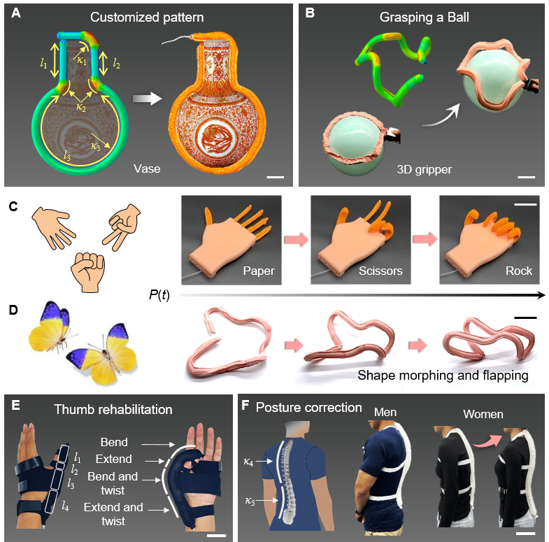 为了解决上述问题,研究团队揭示了缝纫对织物的应变约束规律,并在此基础上提出了“编码缝制约束”的力学新机制,分别将能够对针织织物拉伸性进行强约束的直线型缝边和调节的之字形缝边编码为二进制的“0”和“1”。研究团队通过嵌入不同拉伸信息的编码缝边,为气动织物软机器有效构建了各向异性力学织物约束壳,实现了力学约束设计和制造成型的一体化,进一步发展了三边编码缝边全局约束新方法。该方法可以极大降低气动织物软机器的复杂三维变形设计和理论预测难度,并提升定制化开发的效率。此外,研究团队还发现调节缝边之间的间距会改变变形的时序,并通过建立的气囊非线性膨胀和各向异性织物应变约束的耦合力学模型,准确预测了时序变形规律。
