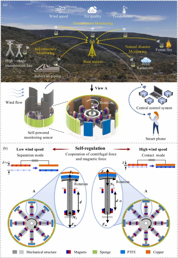本文提出一种具有自调控策略的摩擦纳米发电机(TENG-SS),实现了自供能风速传感。通过合理设计离心力和非线性磁力,摩擦纳米发电机功能材料的分离和接触程度可针对不同风速自动调节。风速较低时,气动力小,在自调节下摩擦阻力也小,装置容易启动,磨损小;在高风速下,空气动力可以克服更大的摩擦阻力,产生更多的电能。基于TENG-SS的工作原理,本文建立了动力学模型,并进行了实验验证,分析了关键参数对TENG-SS性能的影响。此外,在21600秒的自然风环境中,本文对有和无自调控策略的样机进行了比较,证明了所提出的TENG-SS具有更好的电学性能和鲁棒性。这种自我调节机制具有较高的电学输出性能,减少摩擦阻力和材料磨损,并显著提高设备性能和使用寿命。同时,TENG-SS可以用于自供能风速测量和无线信息传输。本研究提供了新的设计视角,即通过力学调控的方法,提高能量采集系统在复杂环境中的综合性能。