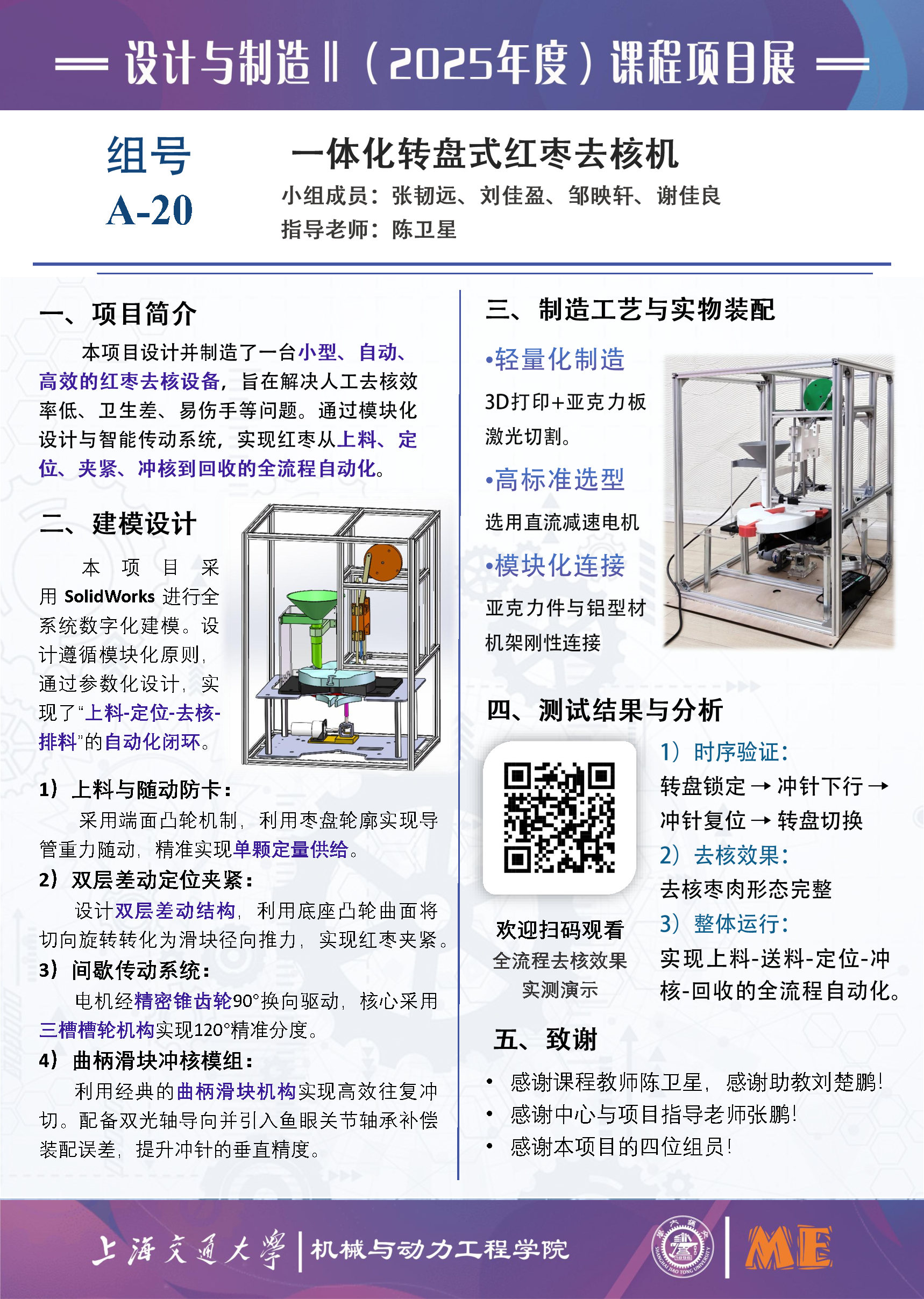 本项目设计并制造了一台小型、 自动、高效的红枣去核设备 , 旨在解决人工去核效率低、 卫生差、 易伤手等问题 。 通过模块化设计与智能传动系统 ,实现红枣从上料、 定位、 夹紧、 冲核到回收的全流程自动化 。