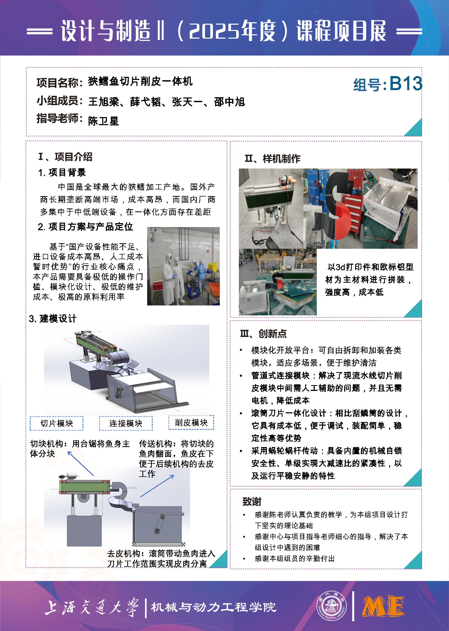 中国是全球最大的狭鳕加工产地。 国外产商长期垄断高端市场, 成本高昂, 而国内厂商多集中于中低端设备, 在一体化方面存在差距。基于“国产设备性能不足、进口设备成本高昂、 人工成本暂时优势”的行业核心痛点,本产品需要具备极低的操作门槛、 模块化设计、 极低的维护成本、 极高的原料利用率。本项目以“实用、可靠、高效、经济”为核心理念,旨在设计并制造一款适用于狭鳕鱼的切片削皮一体化设备。