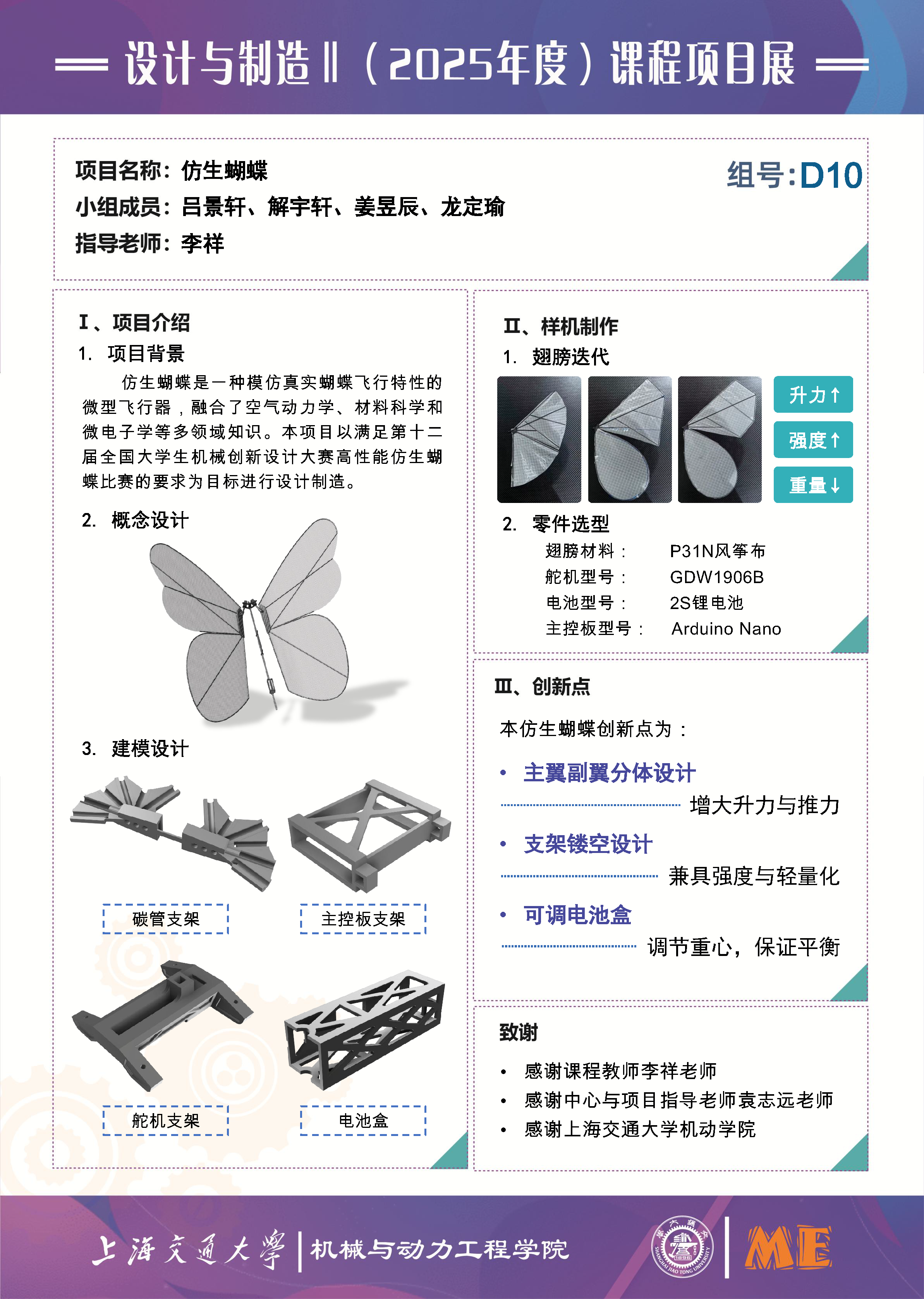 通过自行确定各个部件的所需的参数,选定型号并完成蝴蝶整体结构的制作装配;通过代码控制和遥控器与接收器对频连接,经过多次参数的修改和调试,实现稳定操控蝴蝶的起飞、自主降落、一定半径内转弯、较长续航等功能。