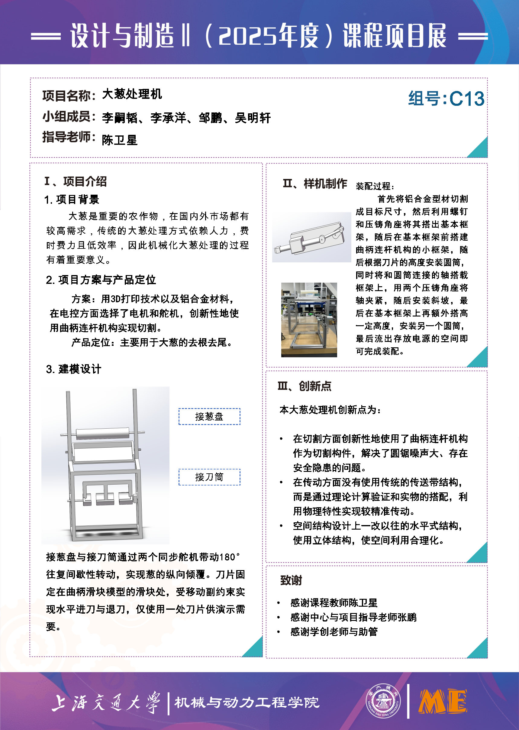 大葱是重要的农作物, 在国内外市场都有较高需求, 传统的大葱处理方式依赖人力, 费时费力且低效率, 因此机械化大葱处理的过程有着重要意义。本产品用3D打印技术以及铝合金材料,在电控方面选择了电机和舵机, 创新性地使