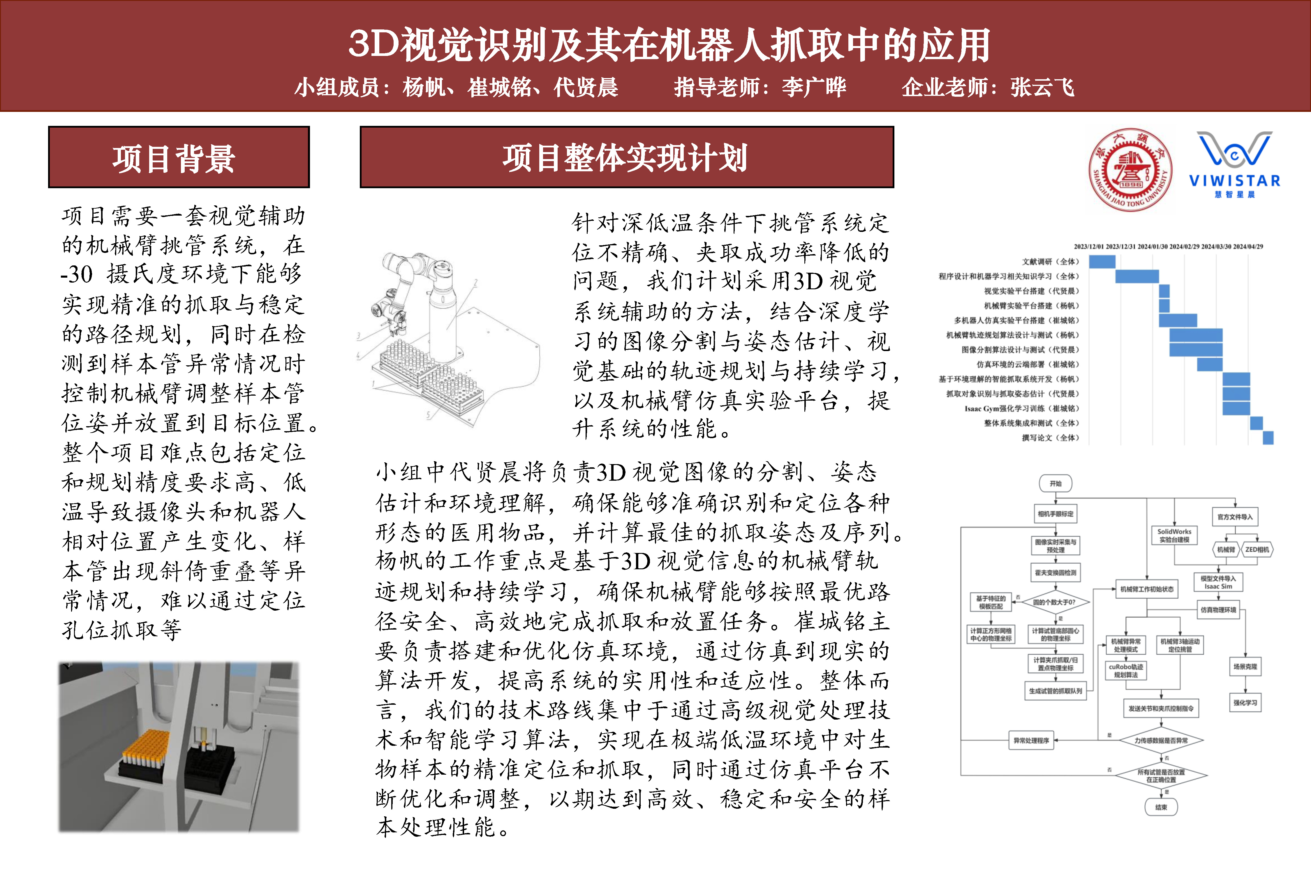 本项目针对深低温条件下挑管系统定位不精确、夹取成功率低的问题,计划将传统图像处理算法和深度学习算法结合,通过2D工业相机获取冻存盒孔位信息、深度相机获取样本管的距离信息,结合先进的图像分割与姿态估计技术,确保在异常情况下仍能准确识别和定位样本;通过基于3D视觉信息进行机械臂轨迹规划和持续学习,确保机械臂能够按照最优路径安全、高效地完成抓取和放置任务;通过搭建和优化机械臂仿真实验平台,通过强化学习的训练和仿真到现实的算法开发,提高系统的实用性和适应性。