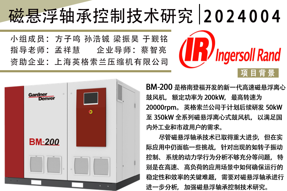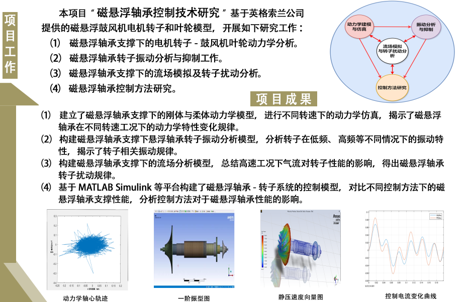 本项目旨在解决英格索兰在磁悬浮轴承应用中遇到的问题,如转子振动、控制成本过高、适应性和普遍应用性不高等。通过磁悬浮轴承支撑下的电机转子-鼓风机叶轮动力学分析揭示其在不同工况下运动规律,为优化设计提供依据。通过转子振动分析与抑制工作,识别和分析导致振动的主要因素,提出可能的振动抑制措施。通过流场模拟及转子扰动分析分析高速转子在磁轴承支撑下的流场行为和扰动效应揭示其在流场中的运动规律,更加全面分析了解磁悬浮轴承控制。通过磁悬浮轴承控制方法研究分析不同磁悬浮轴承控制策略的系统性能,探索更合适的控制策略。