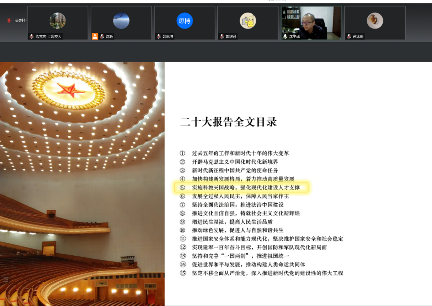 12月30日,航空动力研究所党支部教工党支部联合研究生党支部,组织开展学习党的二十大精神主题党日活动,邀请350vip8888新葡的京集团马克思主义学院沈辛成老师做题为“科技为根 人才为源:定位中国式现代化征程中的卡脖子问题”的主题讲座,50余名师生党员线上参加了此次活动。活动由航空动力研究所教工党支部组织委员沈昕主持。