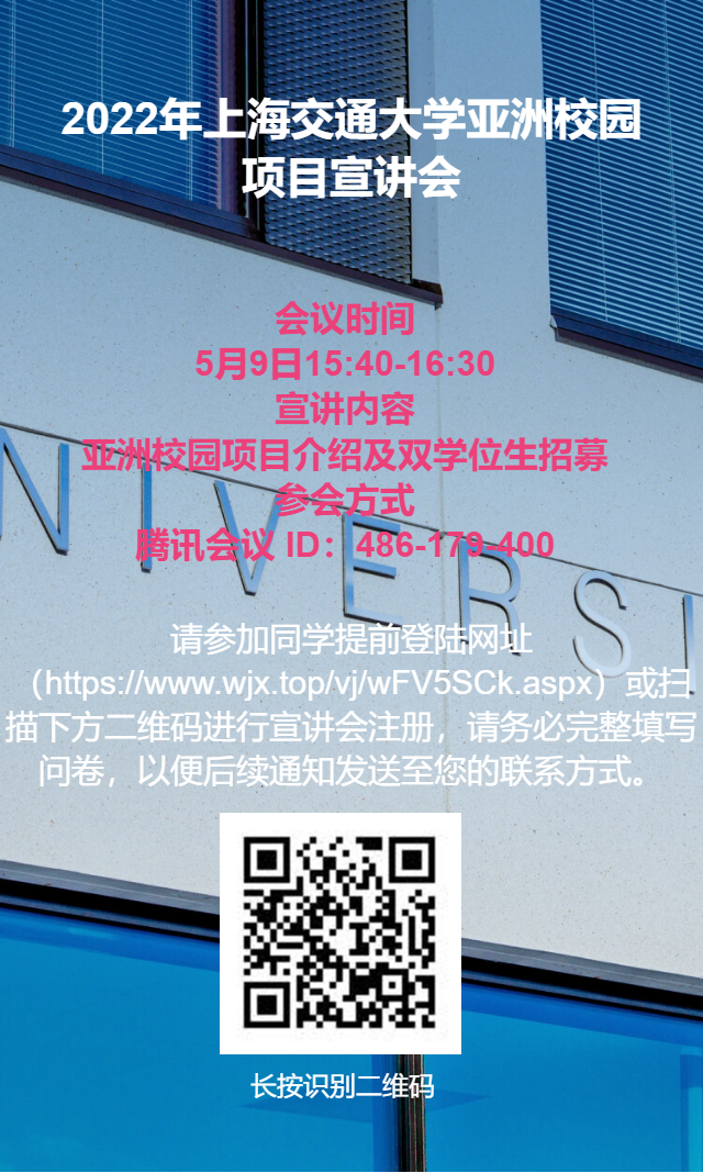 5月9日(周一)学校研究生院将举办“2022年350vip8888新葡的京集团亚洲校园项目线上宣讲会”,届时将为大家详细讲解亚洲校园项目、双学位生招募等内容。同时,将邀请往届学员进行学习体验分享。