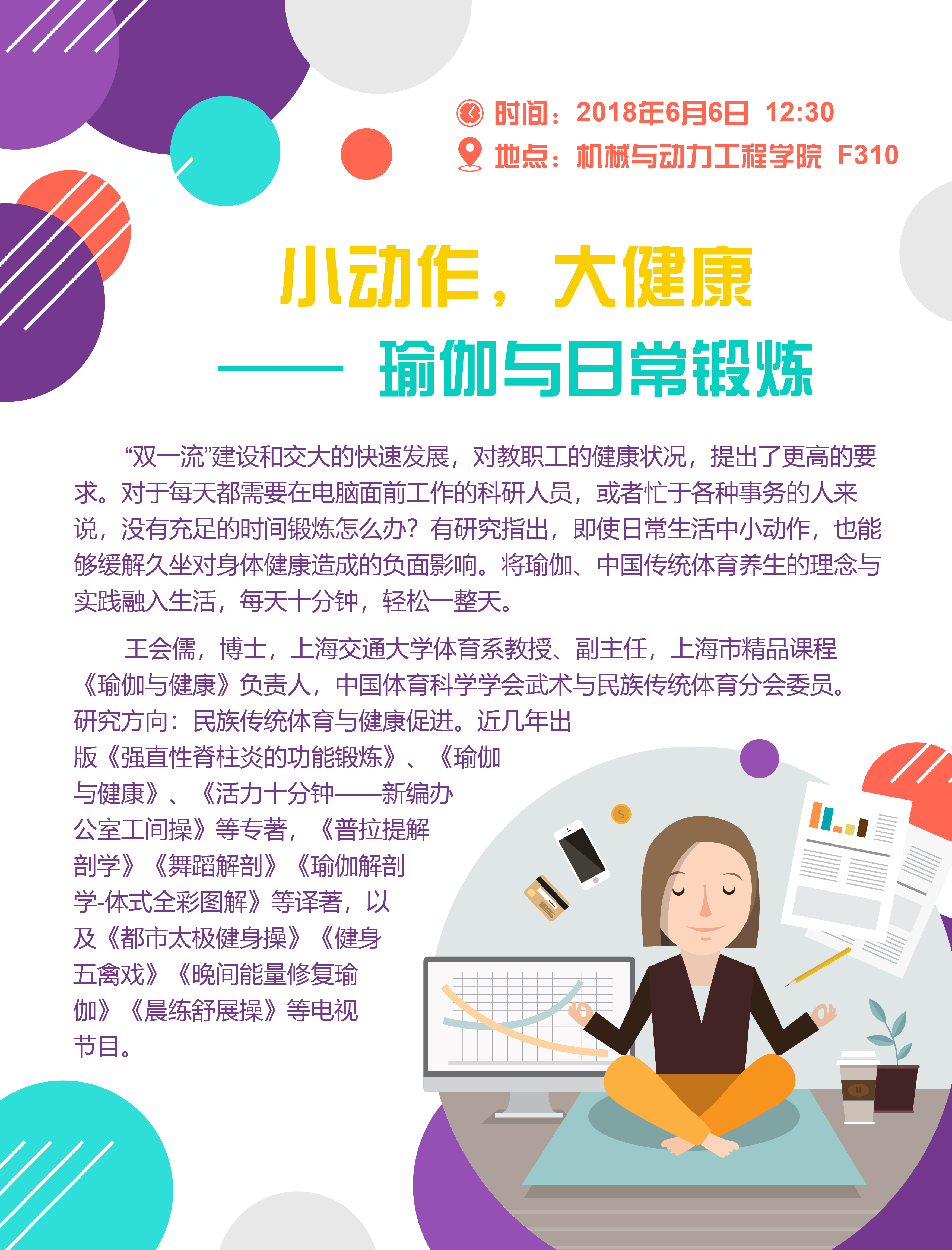 “双一流”建设和交大的快速发展,对教职工的健康状况,提出了更高的要求。对于每天都需要在电脑面前工作的科研人员,或者忙于各种事务的人来说,没有充足的时间锻炼怎么办?有研究指出,即使日常生活中小动作,也能够缓解久坐对身体健康造成的负面影响。将瑜伽、中国传统体育养生的理念与实践融入生活,每天十分钟,轻松一整天。