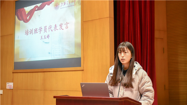 培训班学员代表王玉婷从理论学习、实践教学这两个方面对一个多月的培训班课程进行了回顾和总结。她分享了自己在培训过程中的感悟和收获,并且号召大家以结业典礼为新的起点,积极努力,不断进取,以新的思想武装头脑,以新的姿态迎接挑战,以新的面貌开拓进取,为早日加入中国共产党而努力,为实现中国梦而奋斗。