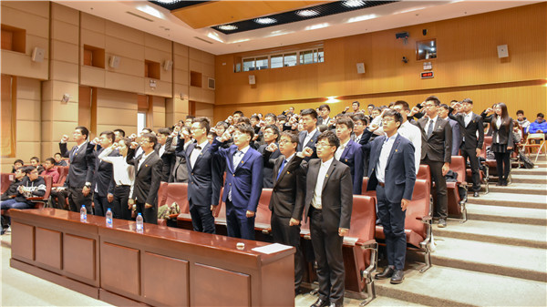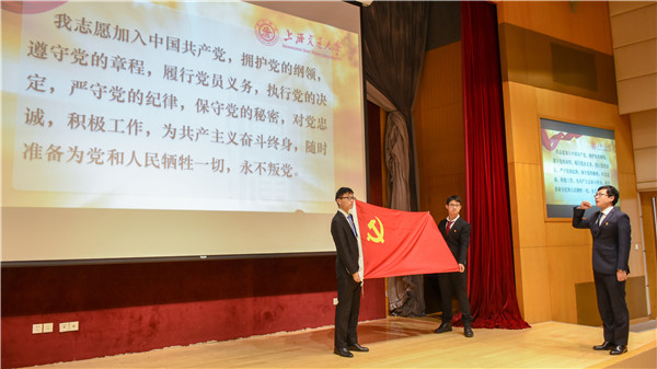 随后举行的是新党员入党宣誓仪式。2018年新党员在学生党建联合会副主席吕博的带领下,高举右拳,面对鲜红的党旗庄严宣誓。