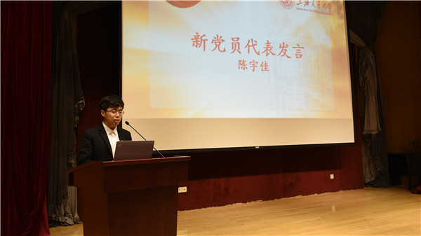 2018年新党员代表陈宇佳向大家回顾了自己的入党历程,并且分享了自己作为预备党员参加宣誓仪式的感悟,他号召党员同志们要不断学习,提高自身的科学文化水平;要志存高远,惜时如金;要始终坚持共产党人的初心与使命,为中国人民谋幸福,为中华民族谋复兴。