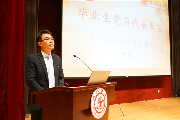 2014级机械工程专业博士生、即将赴中国电子科技集团第十四研究所工作的余觉同学在发言中表达了自己对学校和学院的感恩之情,分享了自己的毕业感想和未来规划。他回顾中华文明发展史和党的历史,列举一代代交大人为推动中国社会进步所做出的重大贡献,表达自己奉献国防、青春报国的梦想,他号召毕业生党员同学们不忘初心,牢记使命,胸怀祖国,心怀人民,矢志不渝,在奋斗中释放青春激情、追逐青春理想,为祖国建设和民族复兴贡献力量。