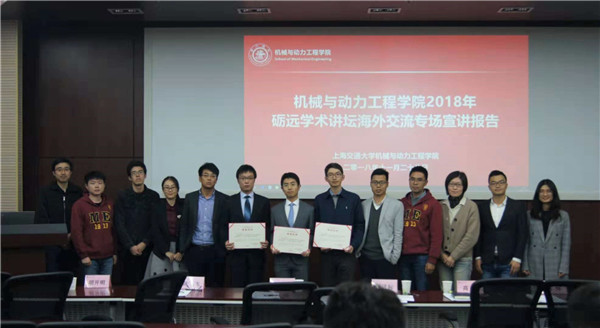 下午,校首届学术之星、振动所博士后胡开明分享了他在加州大学伯克利分校联合培养的经历,并就如何开展科学研究与在座同学交流。随后,8名同学参与宣讲报告答辩,分别汇报展示自己在海外期间的研究成果和心得感悟。最终评委会评定打分,叶轮所2015级博士生于跃龙获一等奖,制冷所2014级博士生徐圣知获二等奖,机器人所2015级博士生谢涛获三等奖。评审专家为获奖同学颁发证书并合影留念。
