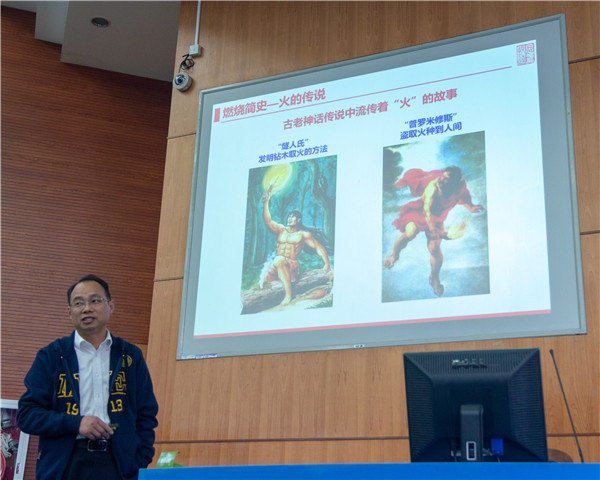 齐飞报告的主题是:燃烧-不熄的话题。他从火的利用开始,讲述燃烧成为一门学科的历史,并概述了未来燃烧的研究趋势。他阐释了燃烧与能源、污染、动力装置等的相互关系,强调了燃烧技术在污染物处理和航空发动机等高科技领域内的重要作用。齐飞介绍了燃烧与能源实验室的人员构成和成果,也欢迎同学们参观了解。最后以题为火焰之美的视频为演讲作结。