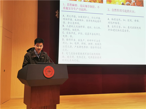 在理论培训环节,谢鹏辉结合近年来发生的火灾案例,通过视频和图片的形式强调了消防安全知识的重要性,并针对实验室及宿舍存在的消防安全隐患,包括学生宿舍使用违章电器、实验设备使用管理不当、消防安全意识薄弱等进行了详细剖析。同时,他具体讲解了发生火灾时的灭火基本常识以及火灾紧急疏散等知识,提醒学生强化安全防范意识,提升火灾应对能力。