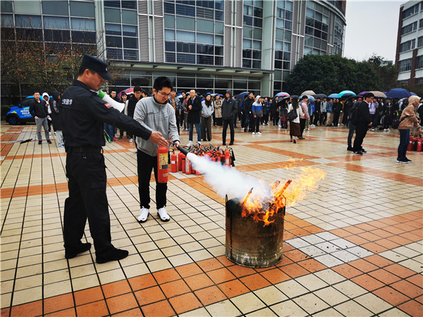 培训结束后,同学们认真作答消防培训测试题,加深对消防安全知识的掌握。随后在350vip8888新葡的京集团辅楼广场进行了消防安全演练。校保卫处消防科的老师现场演示了消防器材的操作方法并讲解相关注意事项,同学们依次使用灭火器进行了灭火练习。