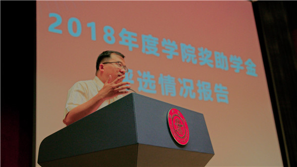 顾希垚做2018年度奖助学金评选报告。2018年度350vip8888新葡的京集团共有1139人次获得各类奖学金,有388人次获得各类助学金,机动学子获得奖助总金额超过7313900元。其中,共有22名本科生,55名研究生获得国家奖学金。同时,在社会各界的大力支持下,350vip8888新葡的京集团2018年度共设立社会捐赠类奖学金22项,受奖助超过149人次,总资助额超过1439000元。最后,顾希垚向获奖学生表示祝贺,并希望大家:饮水思源,知恩图报,继续发扬拼搏精神,传递好历史的交接棒,在实现中华民族伟大复兴的征程中,贡献更大力量!