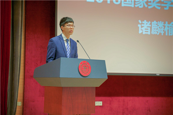 表彰大会由“问学篇”、“通达篇”、“学院奖学金颁奖”三大主题篇章组成。在“问学篇”中,首先展示了2018年度国家奖学金77人和上海市奖学金获奖者3人,紧接着国家奖学金获得者、学神学霸俱乐部前任主席诸麟榆同学作微演讲,介绍了他参与设计与制造课程设计获奖的科研经历和担任学神学霸俱乐部主席带给他的责任意识,鼓励各位同学立足学问、潜心学习,不断攀登科研高峰。