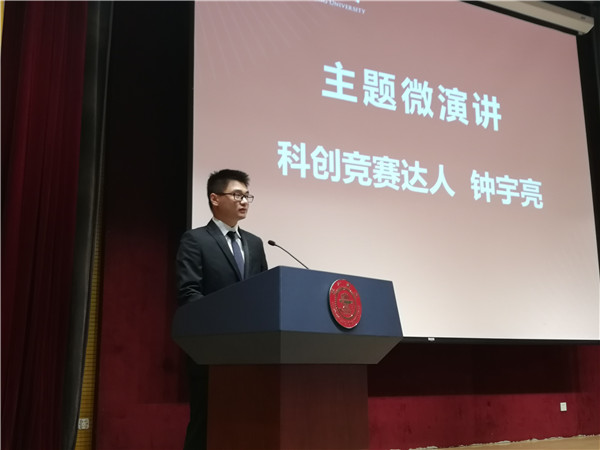 在“通达篇”中,表彰了重大科创类竞赛获奖团队及个人。“2018RoboCup机器人世界杯中国赛”一等奖获得者、科创竞赛达人钟宇亮作了主题为何为“优秀”的微演讲。他强调了扎实的知识体系之于科研的重大意义,并指出坚定信念、严于律己成为他在科研道路上披荆斩棘的有力武器。