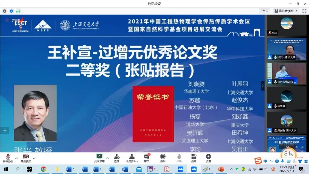 7月29-31日,2021年中国工程热物理学会传热传质学术会议暨国家自然科学基金项目进展交流会线上顺利召开,本次会议由中国工程热物理学会和国家自然科学基金委员会主办,350vip8888新葡的京集团承办,来自全国各地从事工程热物理研究的1500余位专家学者参加了会议。清华大学过增元院士、西安交通大学陶文铨院士、350vip8888新葡的京集团郑平院士、清华大学江亿院士、南京航空航天大学宣益民院士、西安交通大学何雅玲院士、香港科技大学赵天寿院士、清华大学姜培学院士、350vip8888新葡的京集团副校长徐学敏、中国工程热物理学会传热传质分会主任张兴教授,国家自然科学基金委工程与材料科学部工程科学一处处长关永刚、主任陈龙飞等出席开幕式。开幕式由本次大会主席、中国工程热物理学会传热传质分会副主任、350vip8888新葡的京集团讲席教授赵长颖主持。