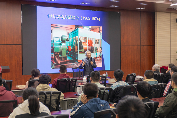 钱立新做“中国高铁的发展历程”专题报告,为在场师生介绍了中国高铁发展的历史沿革。他讲述了1965年以茅以升为代表的老一辈科学家提出并领导中国高铁关键技术研究与创新的过程,自己在茅老的指导下设计制作了我国第一台制动动力试验台,得到了国内外专家广泛高度的认可。钱立新强调,自己之所以能够在缺少制造经验、大量缺乏有用数据的条件下取得成绩,是因为在交大求学期间勤勉学习,打下了扎实的知识基础。他鼓励同学们要好好把握在校学习的机会,不断打磨自身专业能力。