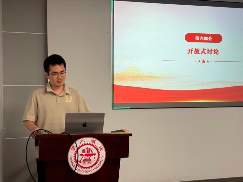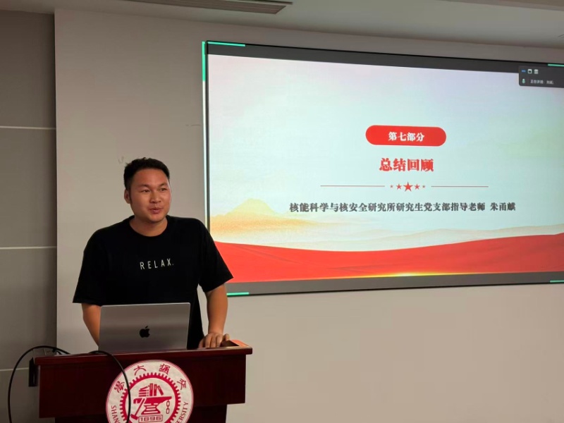 随后,上海交大核能科学与核安全研究所研究生党支部书记刘延以《抗日战争中的交大人》为题作专题分享,系统回顾了交通大学在抗战时期的办学历史,缅怀了在救国图存斗争中涌现出的交大先烈,并深刻阐述了交大“饮水思源、爱国荣校”的校训精神在烽火岁月中的生动实践。刘延指出,这份精神不仅是交大历史的重要底色,更是新时代交大学子矢志科研报国、勇担时代使命的不竭动力。