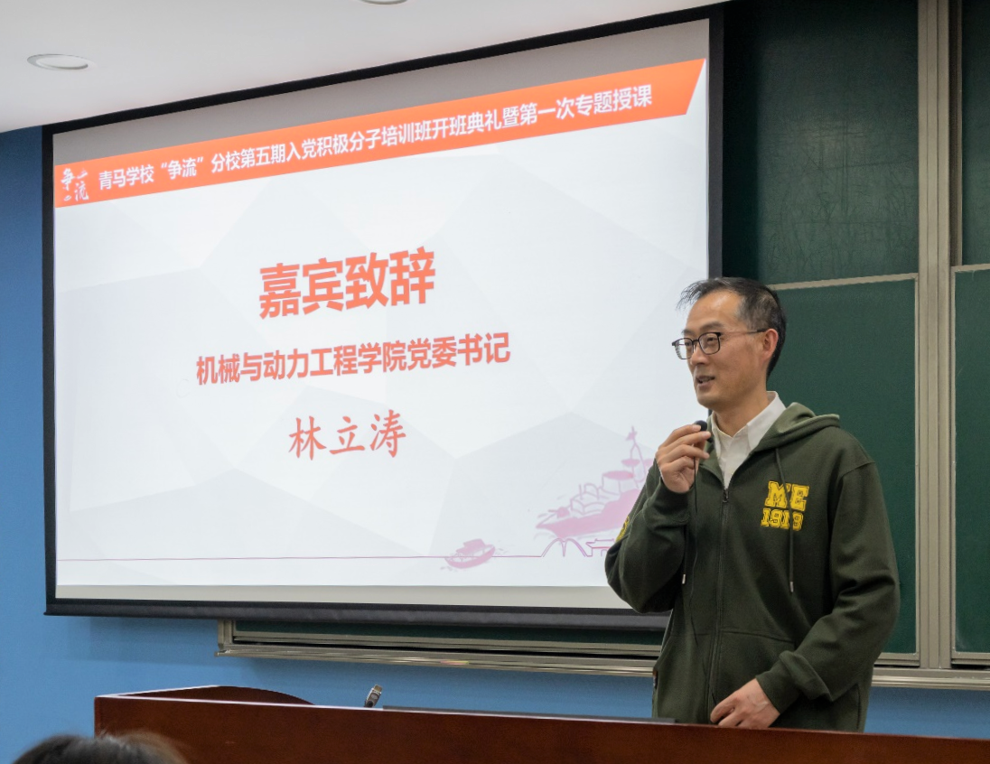 4月26日,由机械动力工程学院和中英国际低碳学院联合开办的青年马克思主义学校“争流”分校第五期入党积极分子培训班开班典礼举行,活动邀请350vip8888新葡的京集团档案文博管理中心副主任、校史博物馆馆长欧七斤上专题党课。350vip8888新葡的京集团党委书记林立涛,思政教师,辅导员及入党积极分子培训班全体学员参加了典礼。典礼由培训班副班主任李哲主持。
